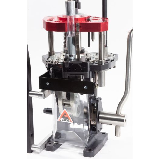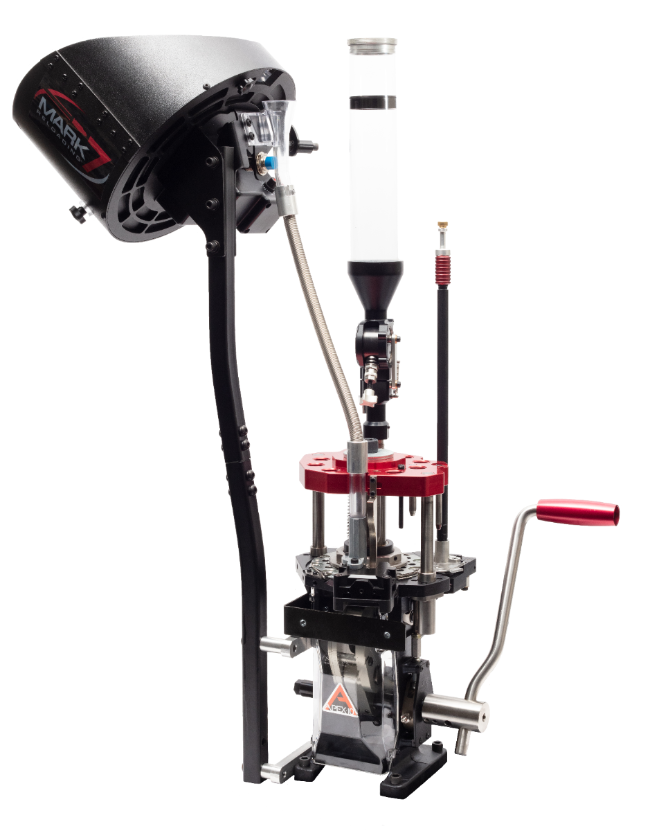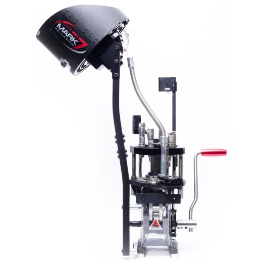The Apex 10® is Mark 7’s premium manually operated press. Featuring a 10 station tool head, the Apex 10 can accommodate pistol and rifle cases from 380 ACP up to 308 Winchester. It includes on press swaging (a standard feature on all Mark 7 presses), an all metal 11” high-speed case feeder, a mechanical powder measure, stacked priming, and a Lyman® Pro Hold Down Die for use over the swage station.